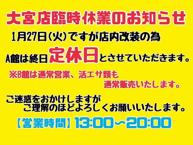 1月27日(火)爬虫類倶楽部 大宮店 臨時休業のお知らせ